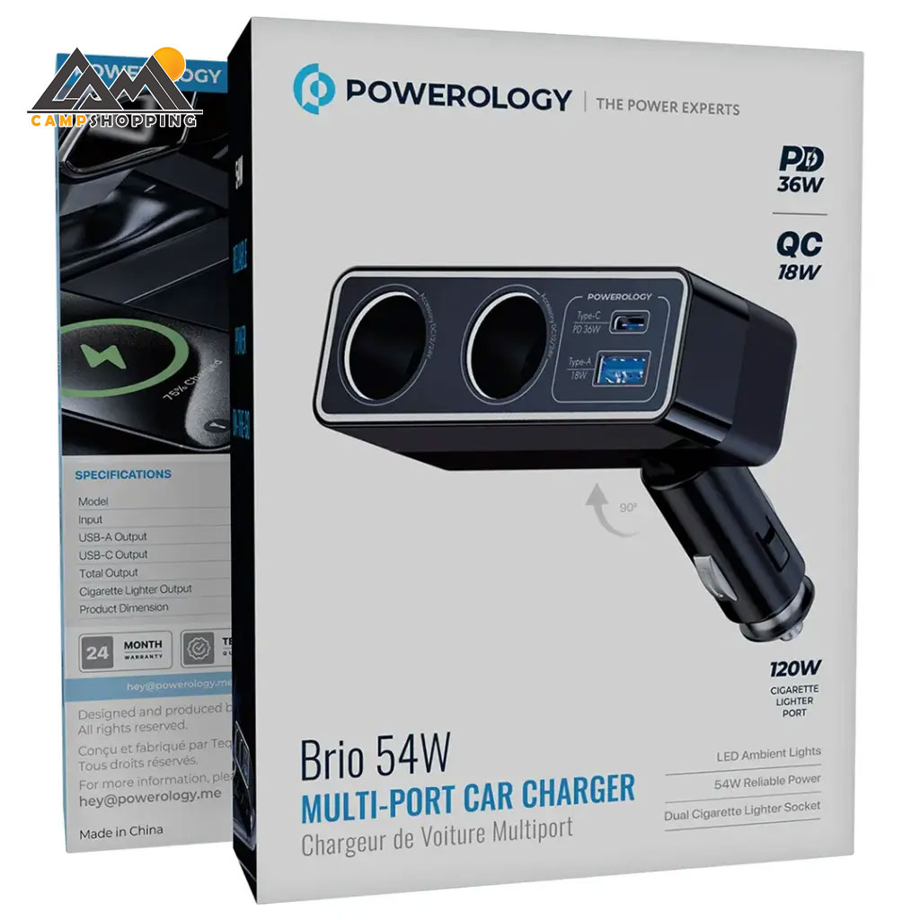 شارژر فندکی Powerology Brio با توان خروجی 54 وات، مجهز به پورت‌های USB-A و USB-C و دو خروجی فندکی، گزینه‌ای قدرتمند و ایمن برای شارژ همزمان چند دستگاه در خودرو است.