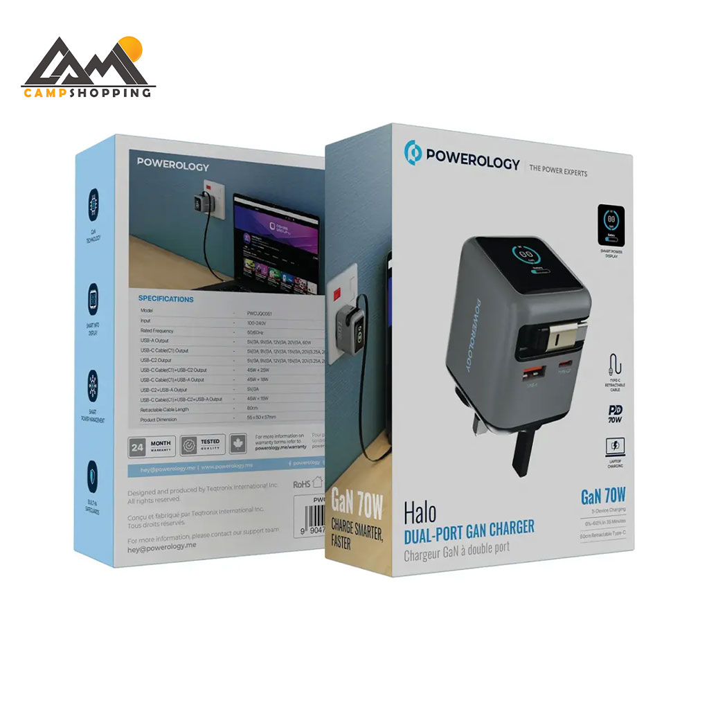 شارژر POWEROLOGY Halo 70W کد PWCUQC051 یک آداپتور قدرتمند و پیشرفته با فناوری GaN (گالیوم نیترید) است که شارژ سریع، ایمن و کمحرارت را برای انواع دستگاهها فراهم میکند. این شارژر با توان خروجی حداکثر 70 وات PD، گزینهای عالی برای شارژ سریع گوشی موبایل، تبلت و حتی لپتاپهای سازگار محسوب میشود.