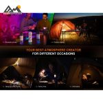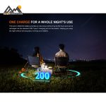 حداکثر روشنایی 500 لومن با برد نور 80 متر، نورپردازی مناسبی برای چادر، کمپ، میز کار یا محیطهای کمنور ایجاد میکند. باتری داخلی 2600 میلیآمپری قابل شارژ، در کمترین حالت نوردهی تا 200 ساعت شارژدهی دارد که برای سفرهای چندروزه و شرایط اضطراری بسیار ایدهآل است. شارژ کامل دستگاه حدود 3 ساعت با ورودی 5V/1A زمان میبرد.