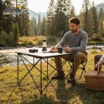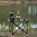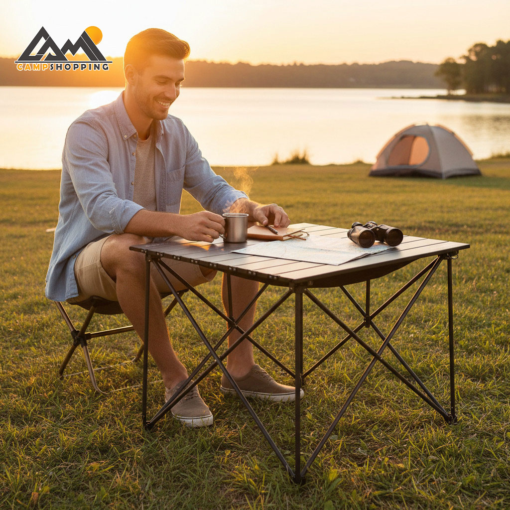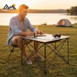 صفحه میز از چندین قطعه آلومینیومی متصل تشکیل شده که هنگام استفاده بهصورت یکپارچه باز میشوند و سطحی پایدار و صاف ایجاد میکنند. این طراحی باعث میشود میز در حالت جمعشده بسیار کمجا باشد و با ابعاد 93×15×12 سانتیمتر بهراحتی در صندوق خودرو یا کنار کوله قرار گیرد.