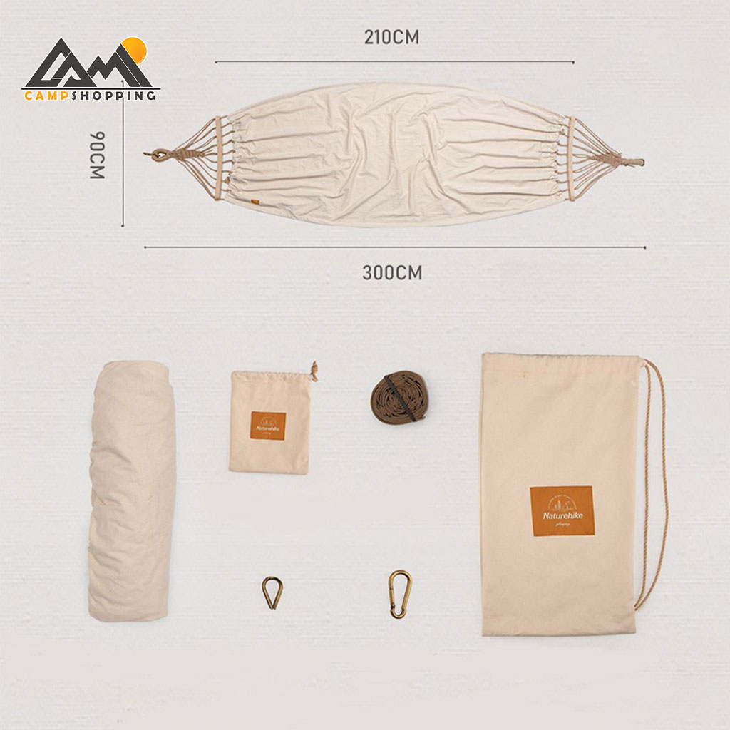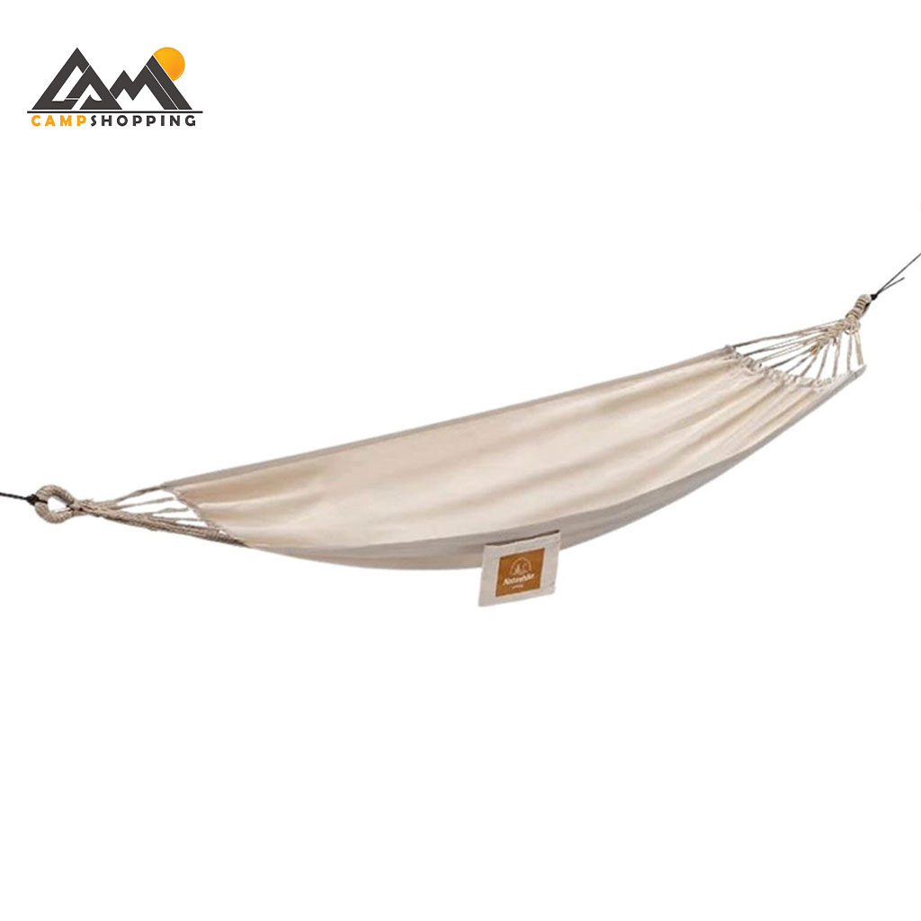 نصب ننو بسیار سریع و آسان است. با استفاده از دو کارابین فلزی محکم و طنابهای نایلونی مقاوم (طول 3 متر، قطر 6 میلیمتر) در کمتر از چند دقیقه آماده استفاده خواهد بود.