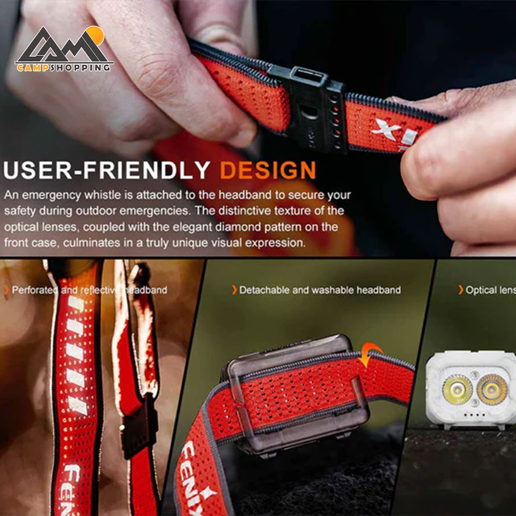 طراحی کلید قفل کشویی (Lockout) از روشن شدن ناخواسته هدلامپ جلوگیری میکند. وجود دو دکمه کنترلی در قسمت بالا، تغییر سریع و آسان حالتهای نوردهی را ممکن میسازد. بند هدلامپ دارای سیستم تنظیم دوطرفه SPORT با پیچ تنظیم است که حتی با یک دست نیز بهراحتی تنظیم میشود و در کنار آن، یک سوت اضطراری برای افزایش ایمنی کاربر تعبیه شده است.
