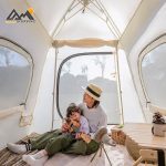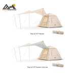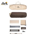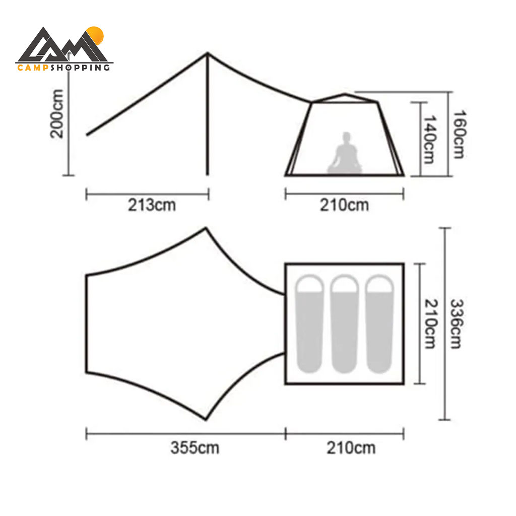 تیرکهای مستحکم از ترکیب آلومینیوم و آهن ساخته شدهاند تا تعادل بین وزن سبک و استحکام بالا حفظ شود. طراحی ارگونومیک با ابعاد داخلی 210×210×140 سانتیمتر فضای کافی برای 3 نفر بزرگسال فراهم میکند. علاوهبراین، سایبان بزرگ 12 متری (3.36×3.55 متر) در جلوی چادر امکان استراحت، آشپزی یا نگهداری تجهیزات را بهراحتی فراهم میکند.