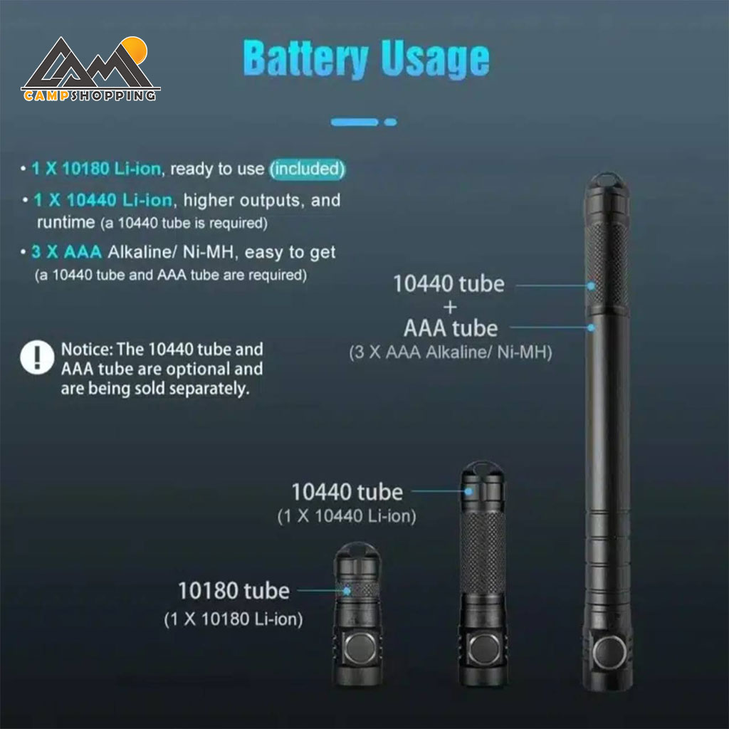 چراغ قوه YM-M10 دارای درگاه شارژ Type-C بوده و با باتری‌های لیتیومی قابل شارژ (10180 و 10440) یا 3 عدد باتری AAA سازگار است. وجود لوله‌های افزایش طول باعث می‌شود بتوان از باتری‌های مختلف استفاده کرد. طراحی جمع‌وجور، زنجیر گردنی و حلقه اتصال، حمل این چراغ قوه را بسیار آسان کرده است.