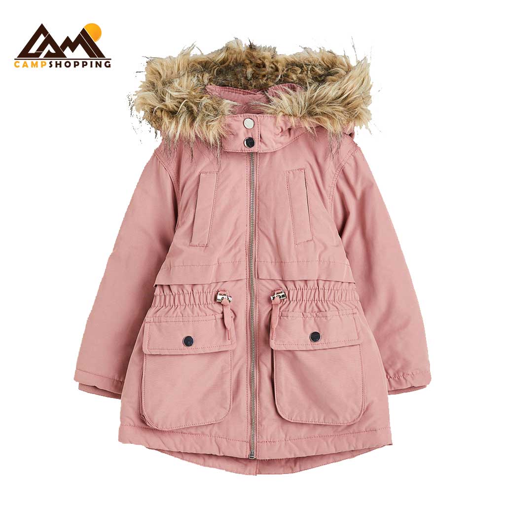 کاپشن دخترانه اچ اند ام، کاپشنی با روکش بافته شده است که به همراه کلاه خز دار با قابلیت جداشدن از کاپشن است. در طراحی این کاپشن زیپی در جلو تعبیه شده که به همراه گارد جلوی چانه و جیب های جلوی کاپشن با دکمه های قابلمه ای و سر آستین های کشسان جهت جلوگیری از ورود سرما، سجاف بلند تر در قسمت پشتی کاپشن و آستر پشمی طراحی شده است.
