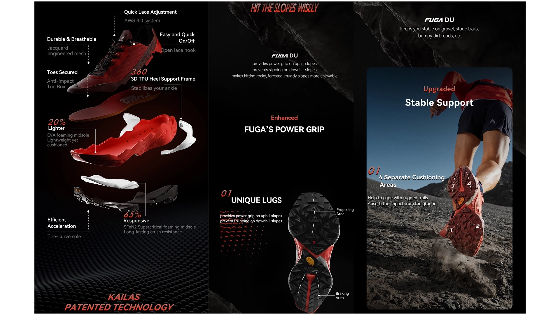 این کفش مجهز به سیستم AWS 3.0™ (Adjust Whole Sole) است که با دو بخش تنظیم مجزا، فشار روی انگشتان در سراشیبی را کاهش داده و در عین حال ثبات میانی پا را افزایش میدهد. همچنین سیستم گتر ۳ نقطهای کایلاس از ورود سنگریزه و شن به داخل کفش جلوگیری میکند.